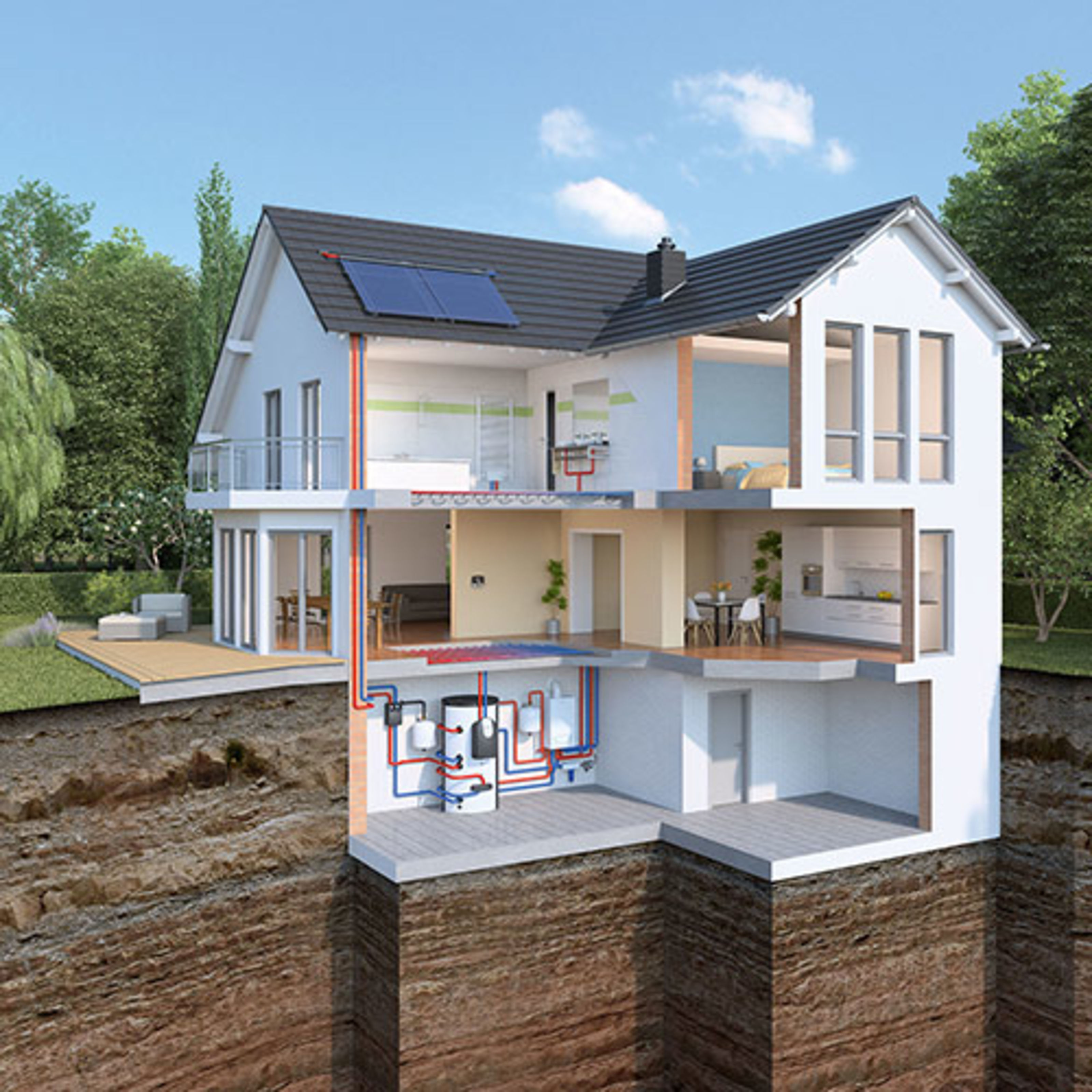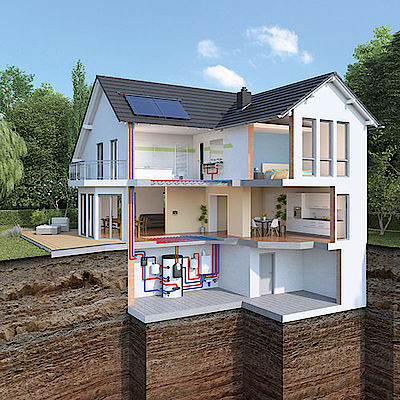 Die Sole/Wasser-Wärmepumpe zeichnet sich durch ein einfaches Prinzip und effiziente Technik aus. Sie wird durch Strom angetrieben und sorgt mithilfe der im Erdboden gespeicherten Wärme für kostengünstigen Wärme- und Warmwasserkomfort. Dabei braucht die Erdwärmepumpe nur 25 Prozent Strom, um 100 Prozent Wärme und warmes Wasser zu erzeugen. Denn die restlichen 75 Prozent Energie werden einfach kostenlos aus dem Erdreich gezogen. Auch im Sommer lässt sich die Technik der Sole/Wasser-Wärmepumpe nutzen, indem die niedrigen Temperaturen im Erdreich aktiv zum Kühlen der Wohnräume verwendet werden.