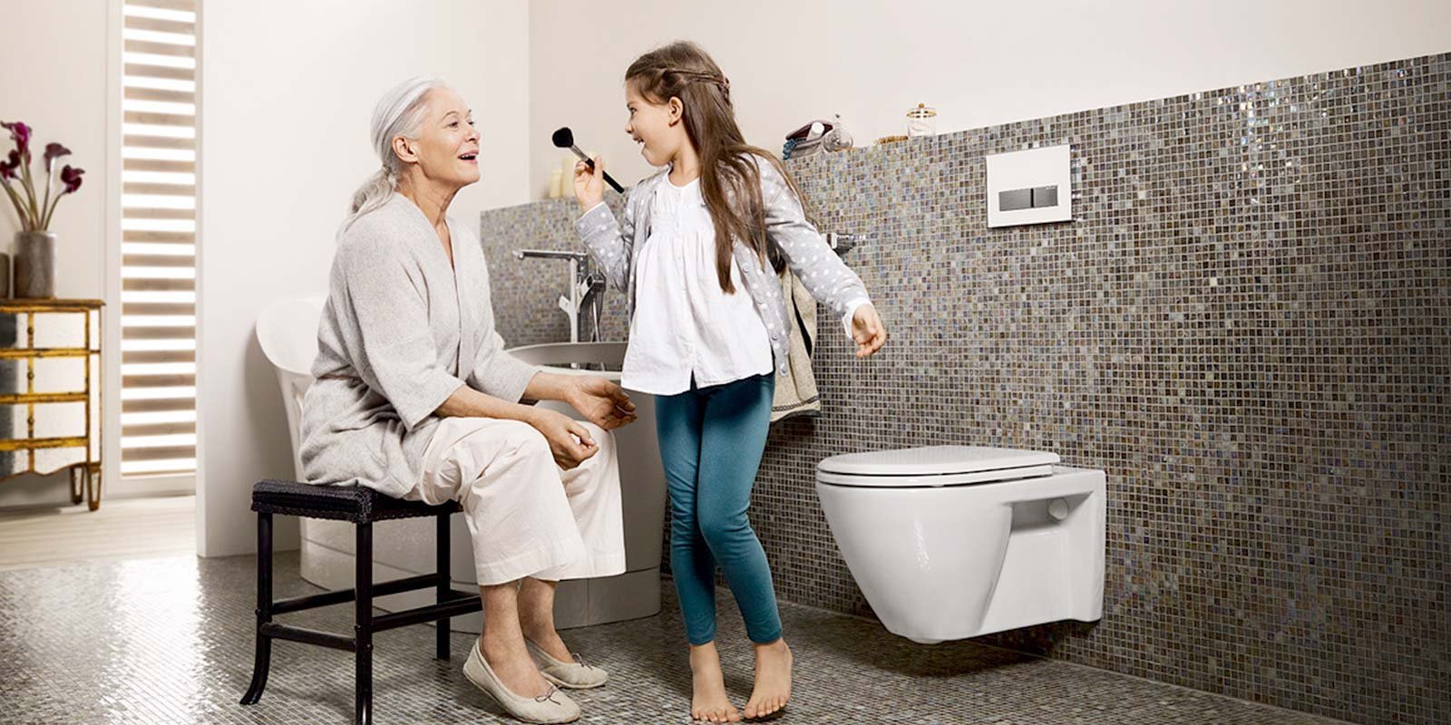Doppelwaschtische, Badewannen mit Tür oder Sitz und höhenverstellbare Waschbecken oder Tritthocker sorgen für mehr Komfort, Sicherheit und Funktionalität für Groß und Klein im Familienbad.