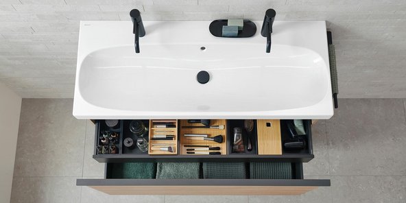 Die neue Acanto Serie glänzt mit durchdachten Lösungen für maximale Raumausnutzung. Dank raumsparender Abläufe entfällt der Siphonausschnitt in den oberen Auszügen der Waschtischunterschränke, was besonders in kleinen Bädern wertvollen zusätzlichen Stauraum schafft. Ein standardisiertes Schubladenordnungssystem und optionale Beleuchtung erhöhen die Flexibilität der Innenraumgestaltung. Der beliebte Hochschrank mit zwei Auszügen wurde ebenfalls optimiert. Ein neues, übersichtliches Ordnungssystem mit herausnehmbaren Boxen und höhenverstellbaren Einlegeböden macht die Nutzung noch komfortabler.