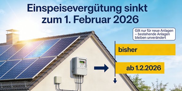 Zum 1. Februar 2026 ist die Einspeisevergütung für neue Photovoltaikanlagen erneut leicht gesunken. Wer seinen Solarstrom überwiegend ins Netz einspeist, erhält dann etwas weniger Vergütung pro Kilowattstunde; für bestehende Anlagen ändert sich weiterhin nichts.