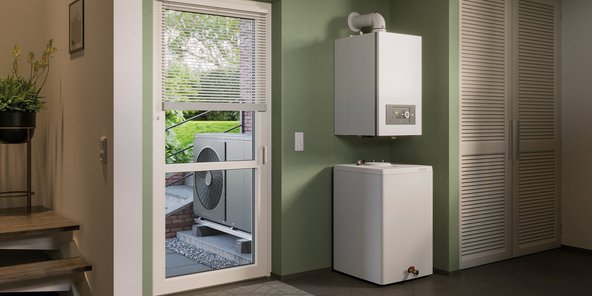 Hybridheizungen bestehen aus mindestens zwei Wärmeerzeugern, die gemeinsam zum individuellen Energiemix beitragen. Zentraler Bestandteil ist eine Wärmepumpe, die umweltfreundlich und effizient für Wohlfühltemperaturen sorgt. Zu dieser regenerativen gesellt sich eine leistungsstarke, fossile Komponente, z. B. Gas-Brennwert.