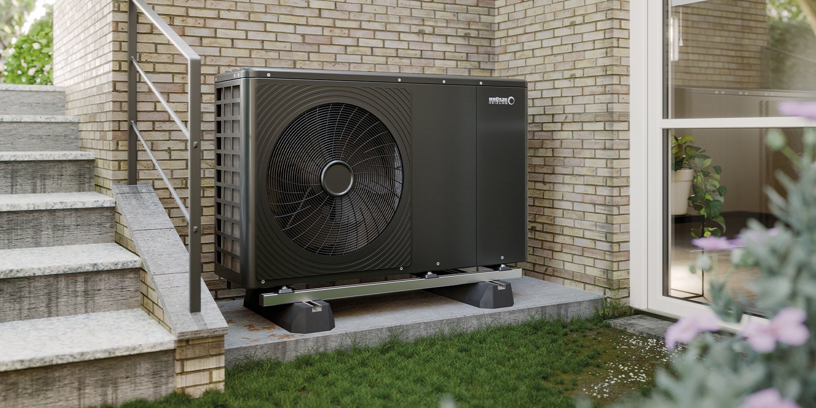Eine Waermepumpe die im Garten montiert ist