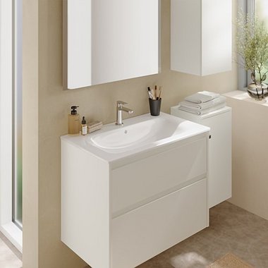 Die modernisierten Geberit Renova Plan Waschtischunterschränke sind auch als Set erhältlich. Die Möbelwaschtisch Sets kombinieren den eingelassenen Renova Waschtisch mit dem passenden Waschtischunterschrank.