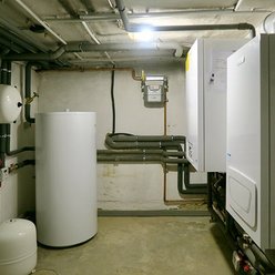 Bis vor Kurzem galt die heute generell favorisierte Wärmepumpentechnik nicht unbedingt als ideale Methode der Wärmeerzeugung für energetisch unsanierte Altbauten. Die benötigten hohen Vorlauftemperaturen bei konventioneller konvektiver Wärmeübertragung durch Radiatoren würden zu einem häufigen Einsatz eines elektrischen Heizstabs führen, was die Gesamteffizienz einer Wärmepumpenanlage empfindlich beeinträchtigen würde, so die bislang vorherrschende Meinung. Trotzdem sollte am Ende der Umbaumaßnahmen auch in Biedenbachs Haus eine Wärmepumpe als Grundlastwärmeerzeuger dienen, die Spitzenlast sollte ein wandhängender Gas-Brennwertkessel neuester Bauart abdecken.